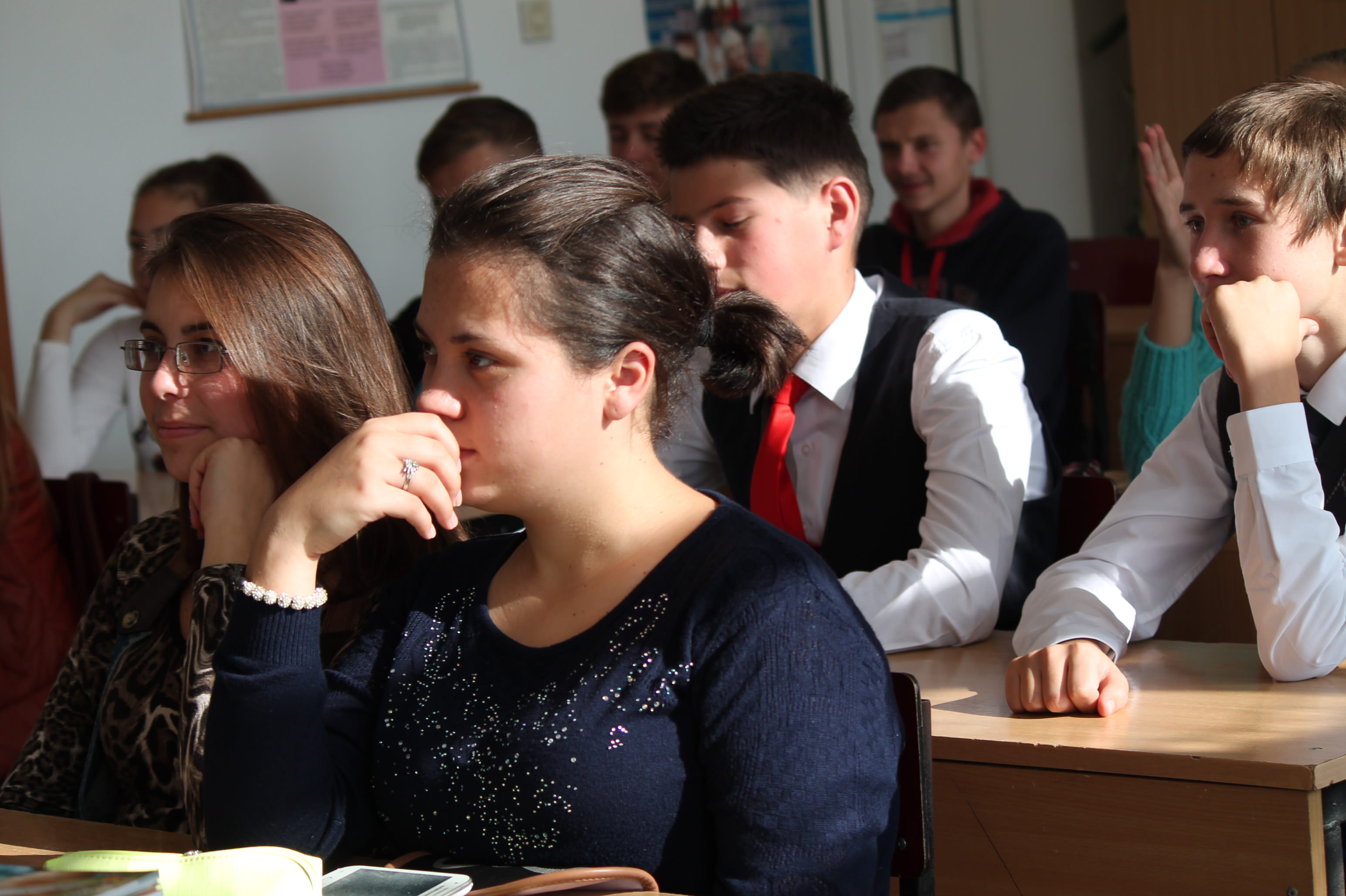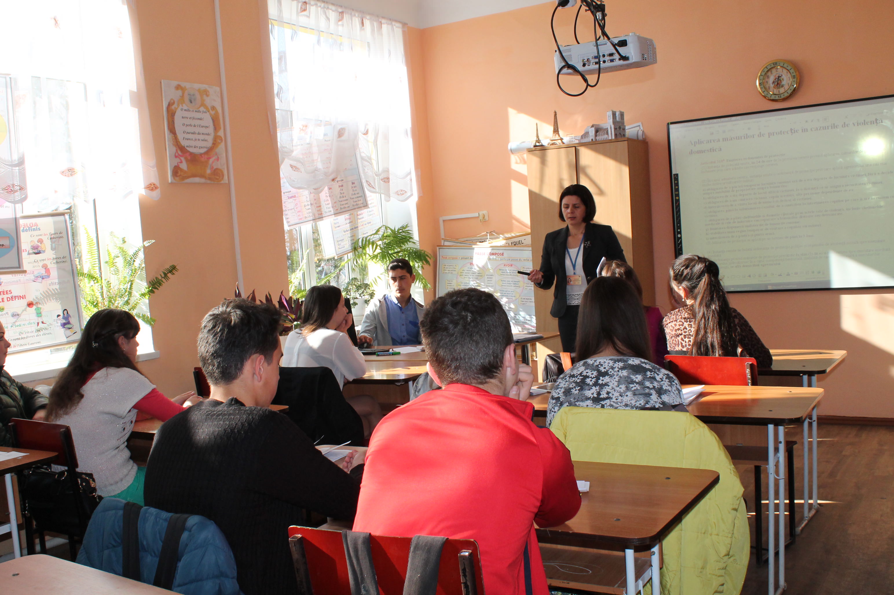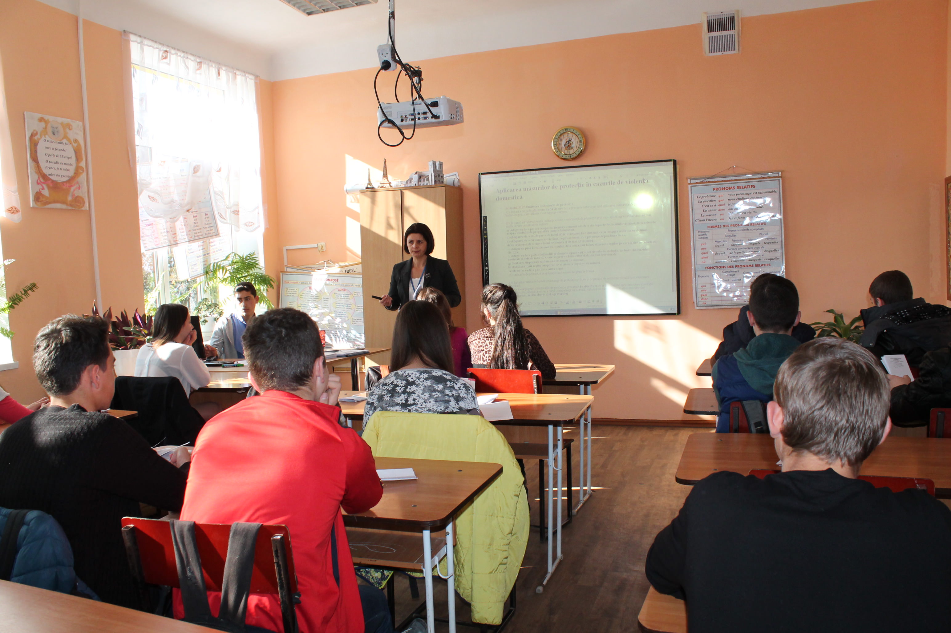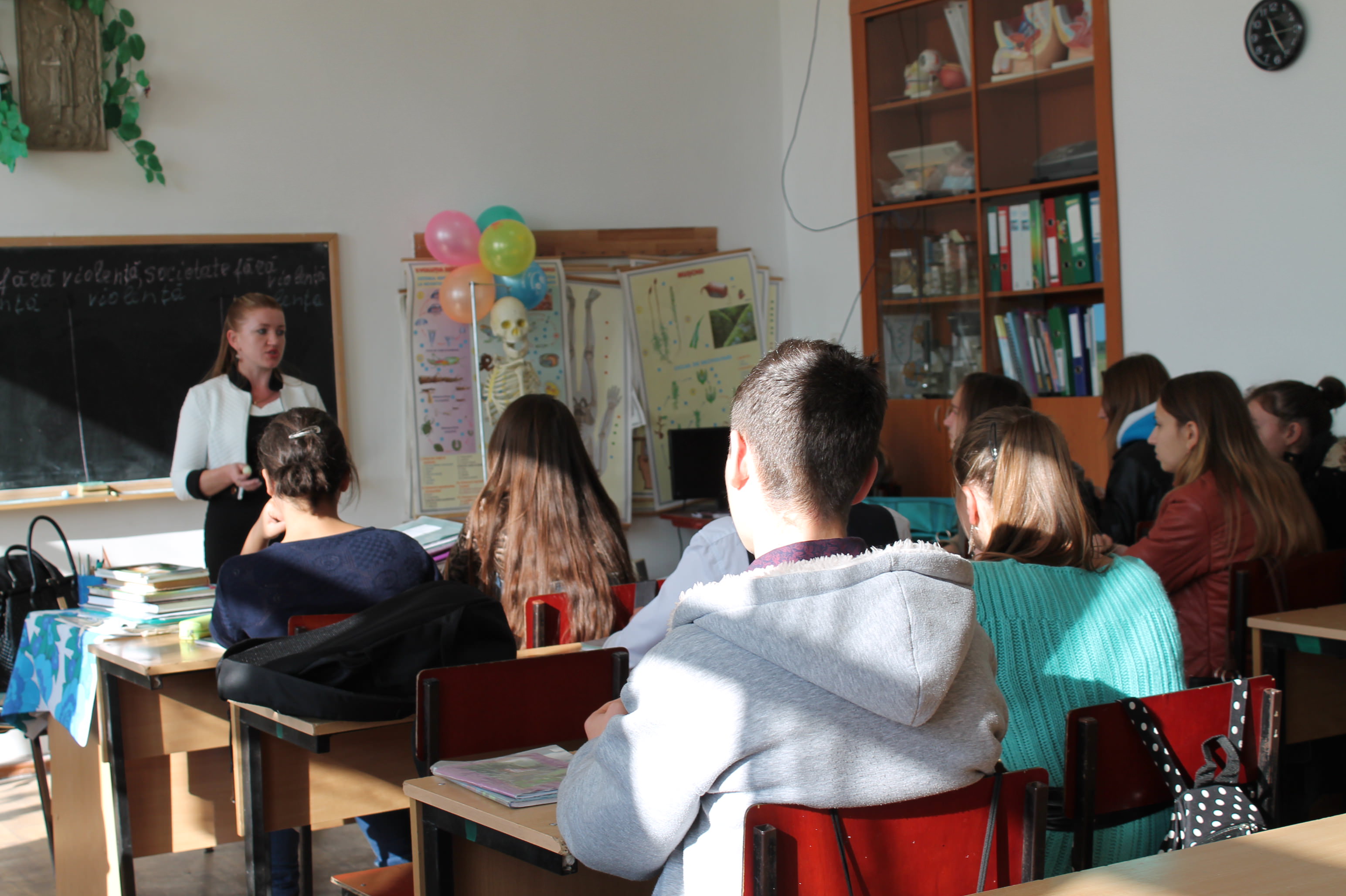 The campaign „Family without violence, society without violence!”arrived on November 6, 2014 to the pupils from Theoretical High School of Budeşti village with educational and instructive activities on the combat of domestic violence topic. Liliana Cerici and Tamara Tentiuc, consultants of the children rights protection service within the Center for Human Rights of the Republic of Moldova held an interactive discussion with the pupils from the 9 grade.