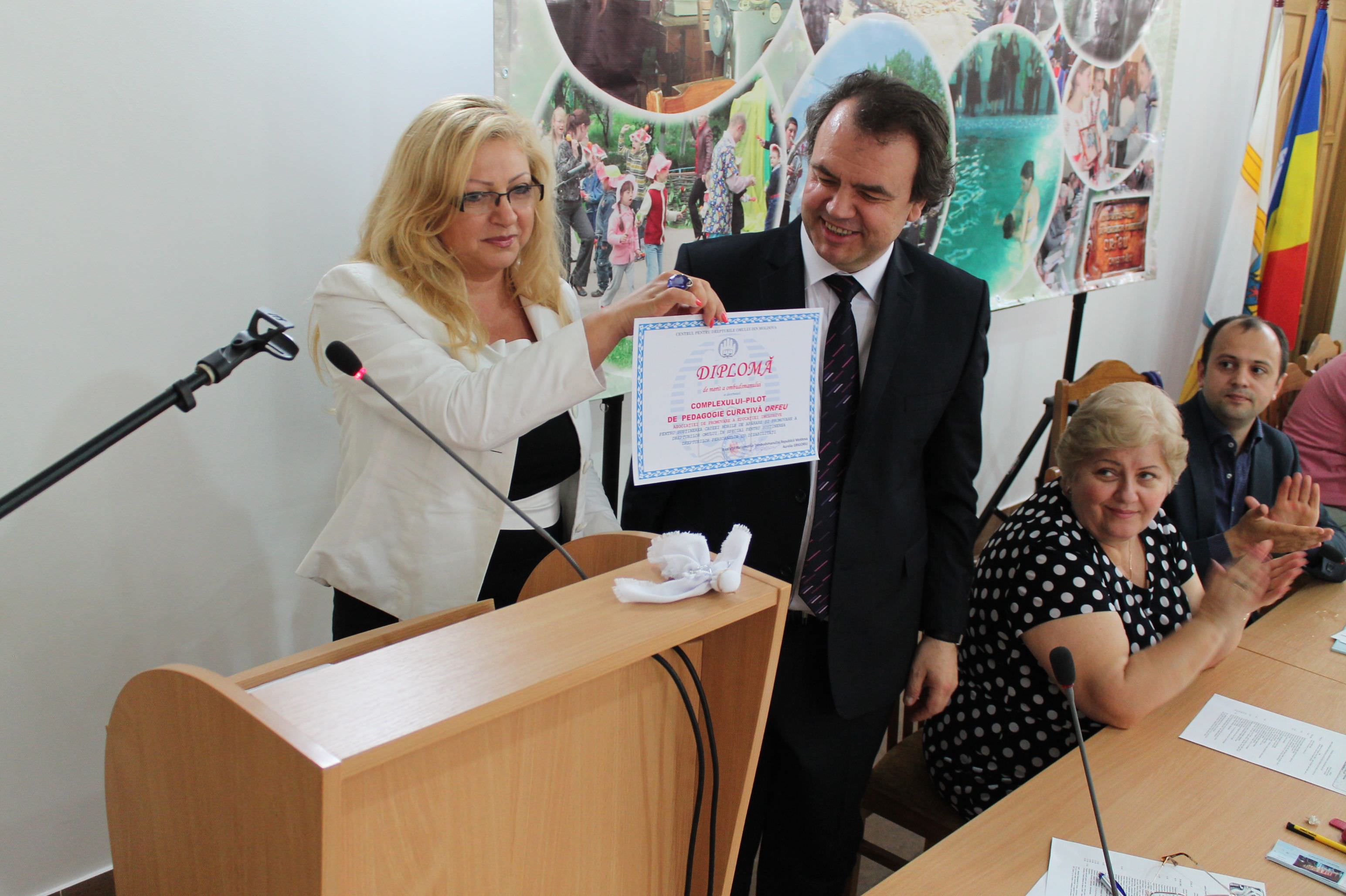 La finalul evenimentului, Avocatul parlamentar a înminat Complexului-Pilot de Pedagogie Curativă ORFEU, Asociaţiei de promovare a educaţiei inclusive, diploma de merit a ombudsmanului pentru susţinerea cauzei nobile de apărare şi promovare a drepturilor omului, în special pentru susţinerea drepturilor persoanelor cu dizabilităţi.