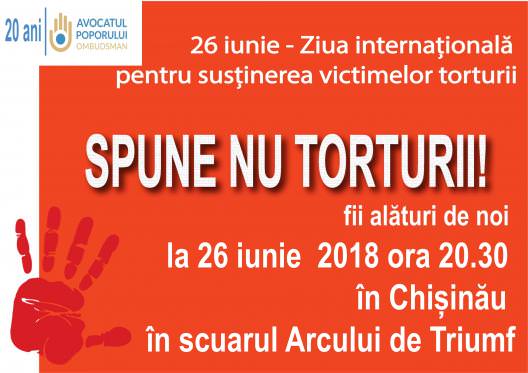 Oficiul Avocatului Poporului în contextul Zilei Internaționale pentru Sprijinul Victimelor Torturii va organiza mai multe activități cu scopul de a atrage atenția opiniei publice asupra problemei torturi și relelor tratamente. Invităm reprezentanții mass-media și toate persoanele interesate de tematica activităților să participe.