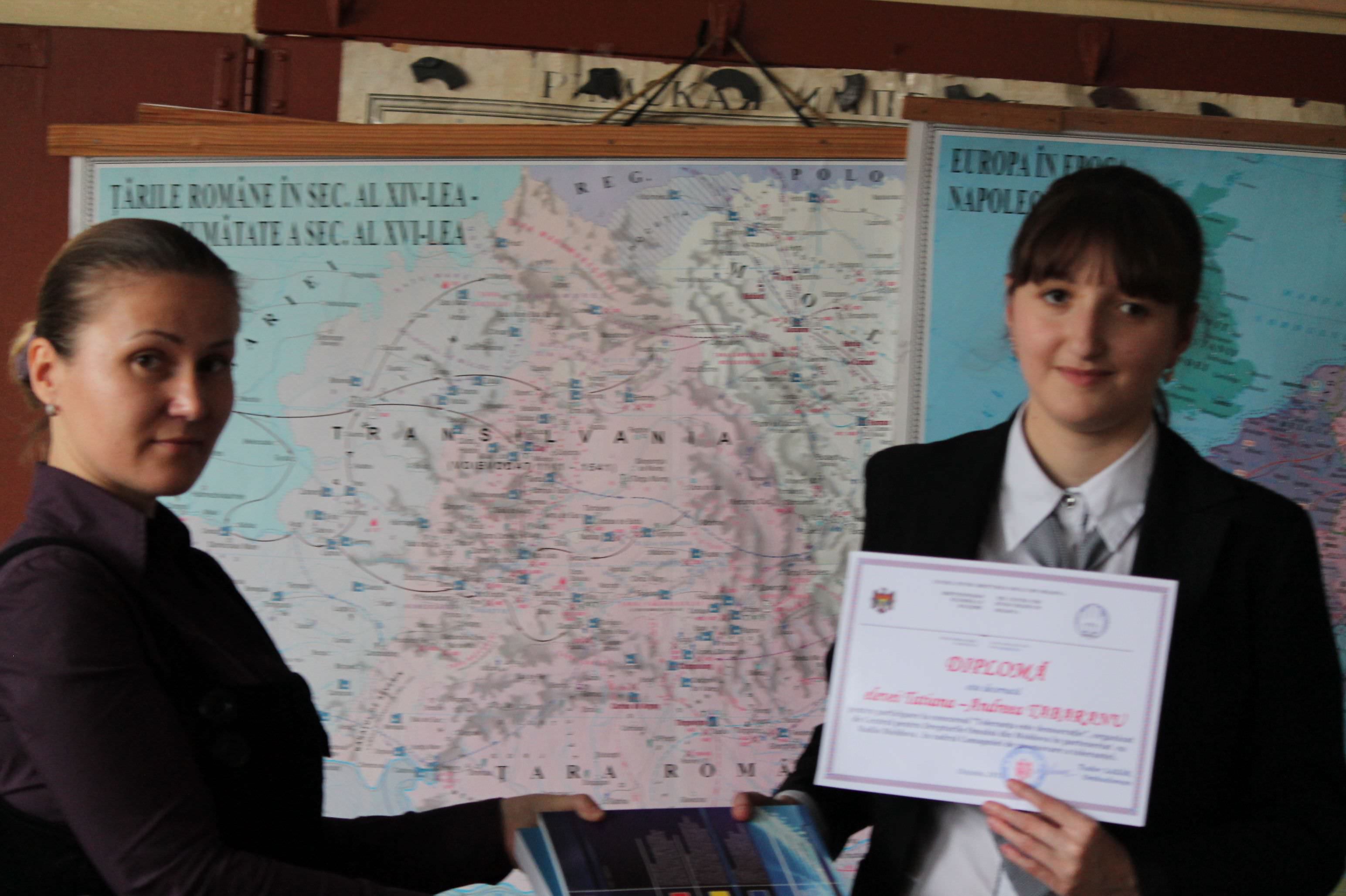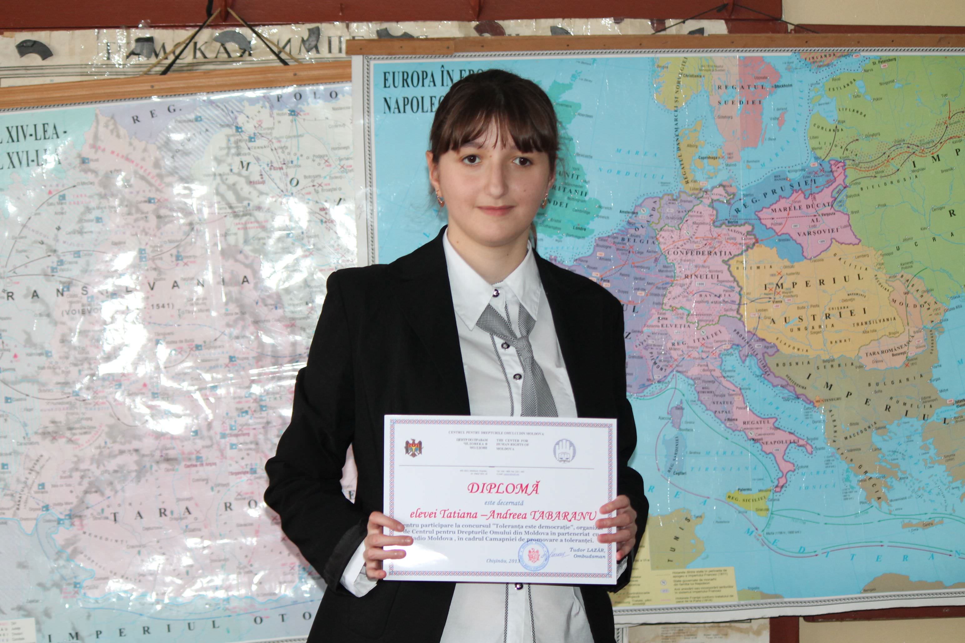 Также на данном уроке была отмечена ученица Татьяна –Андрея Табарану , которая приняла участие в Конкурсе «Демократия-это толерантность», организованном Центром по Правам Человека в Молдове в сотрудничестве с Радио Молдова. Татьяне –Андрее Табарану были вручены грамота и книги.